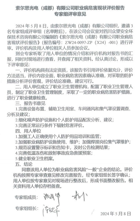 索爾思光電(成都)有限公司職業病危害現狀評價 |